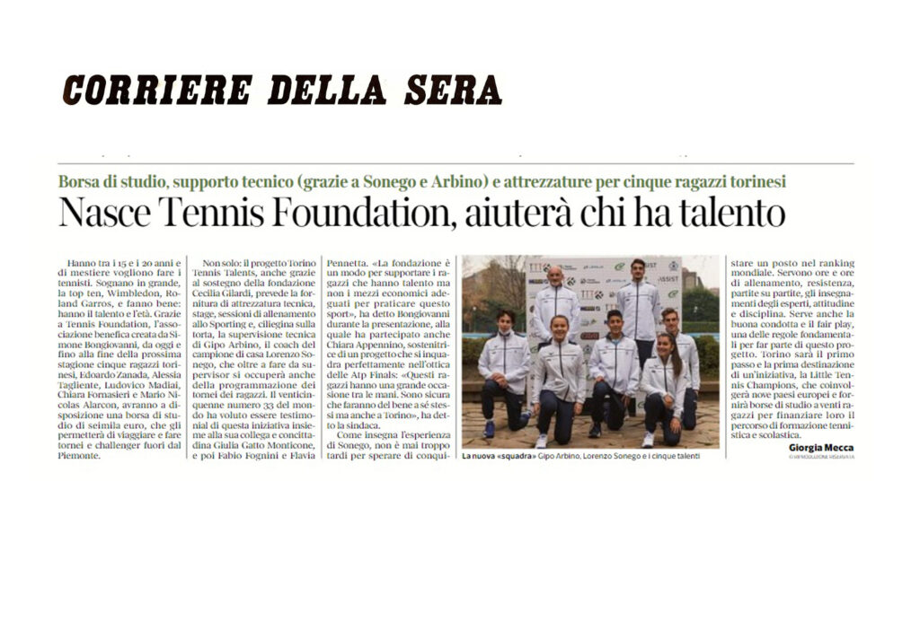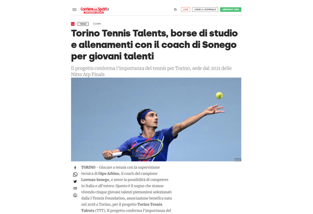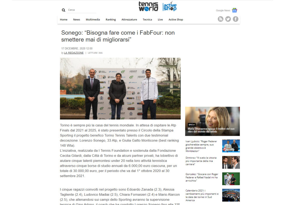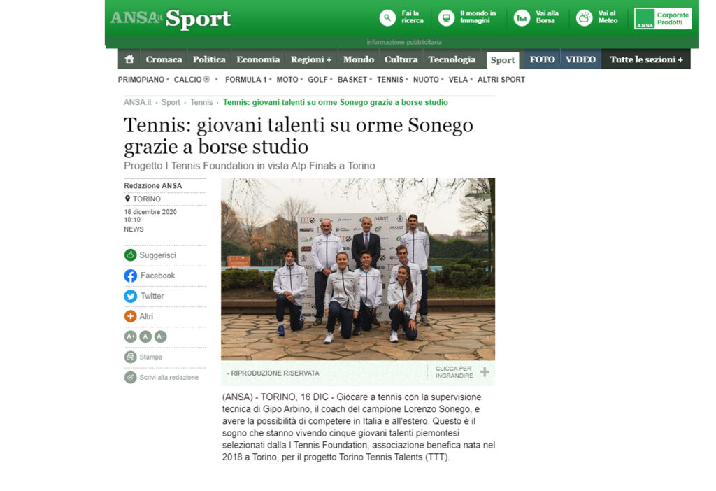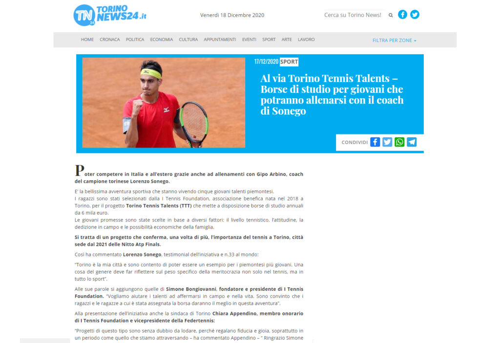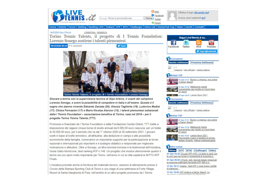 Ecco una selezione della rassegna stampa (cartacea e digitale) relativa alla presentazione del progetto Torino Tennis Talents, il servizio del TG di Rai 3 andato in onda giovedì 17 dicembre e l’intervista a Simone Bongiovanni, founder e presidente di I Tennis Foundation, su Sky Sport.