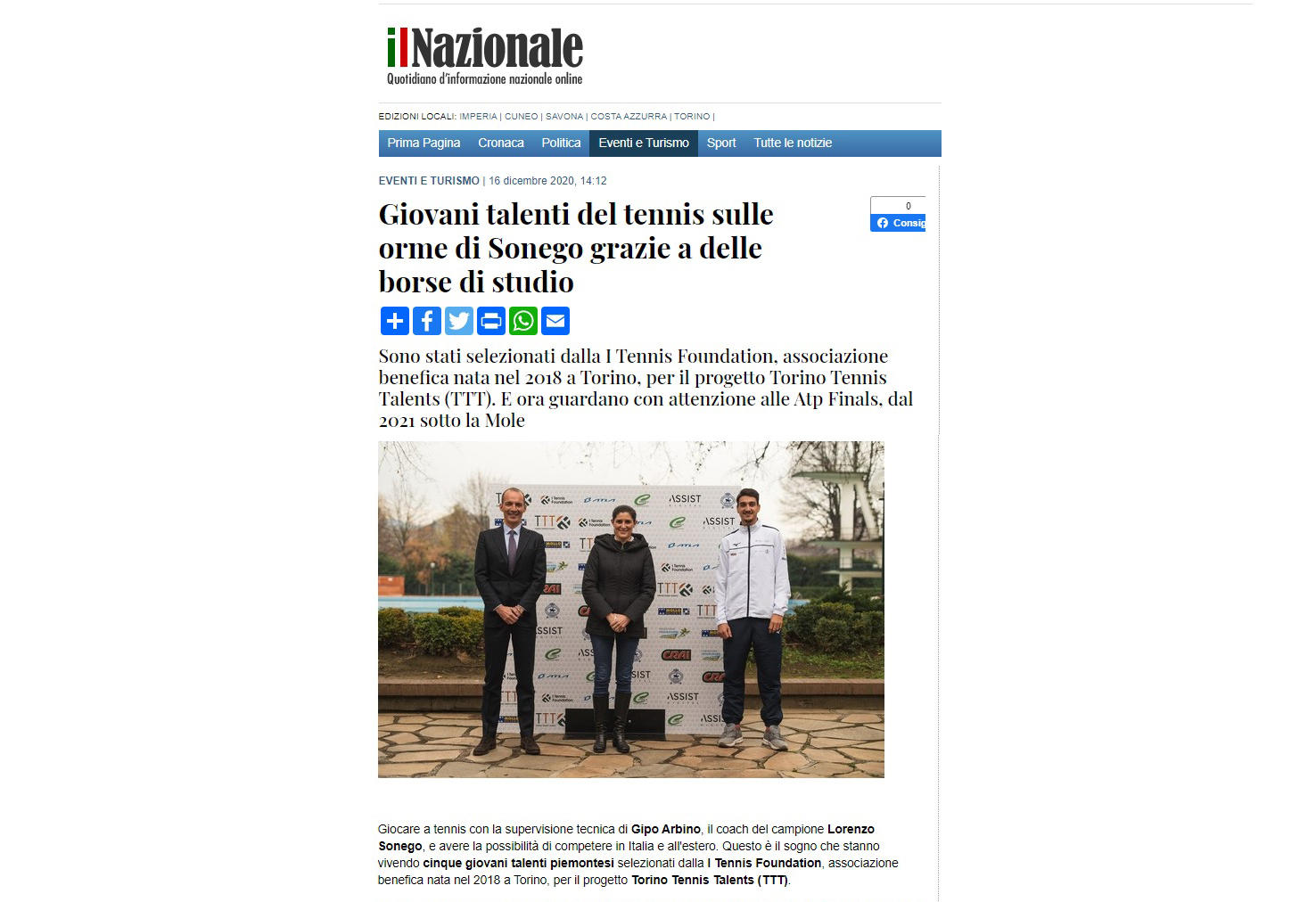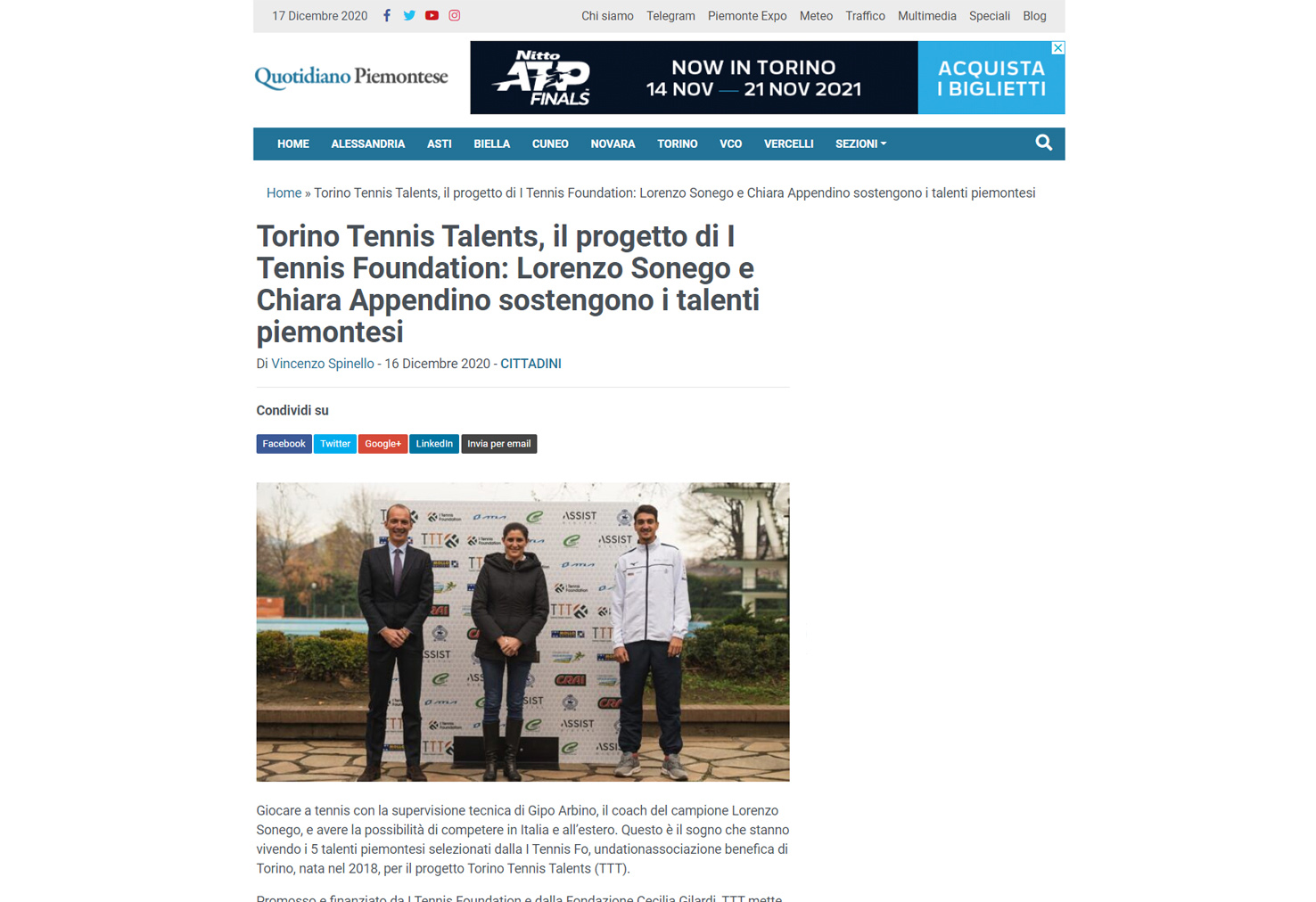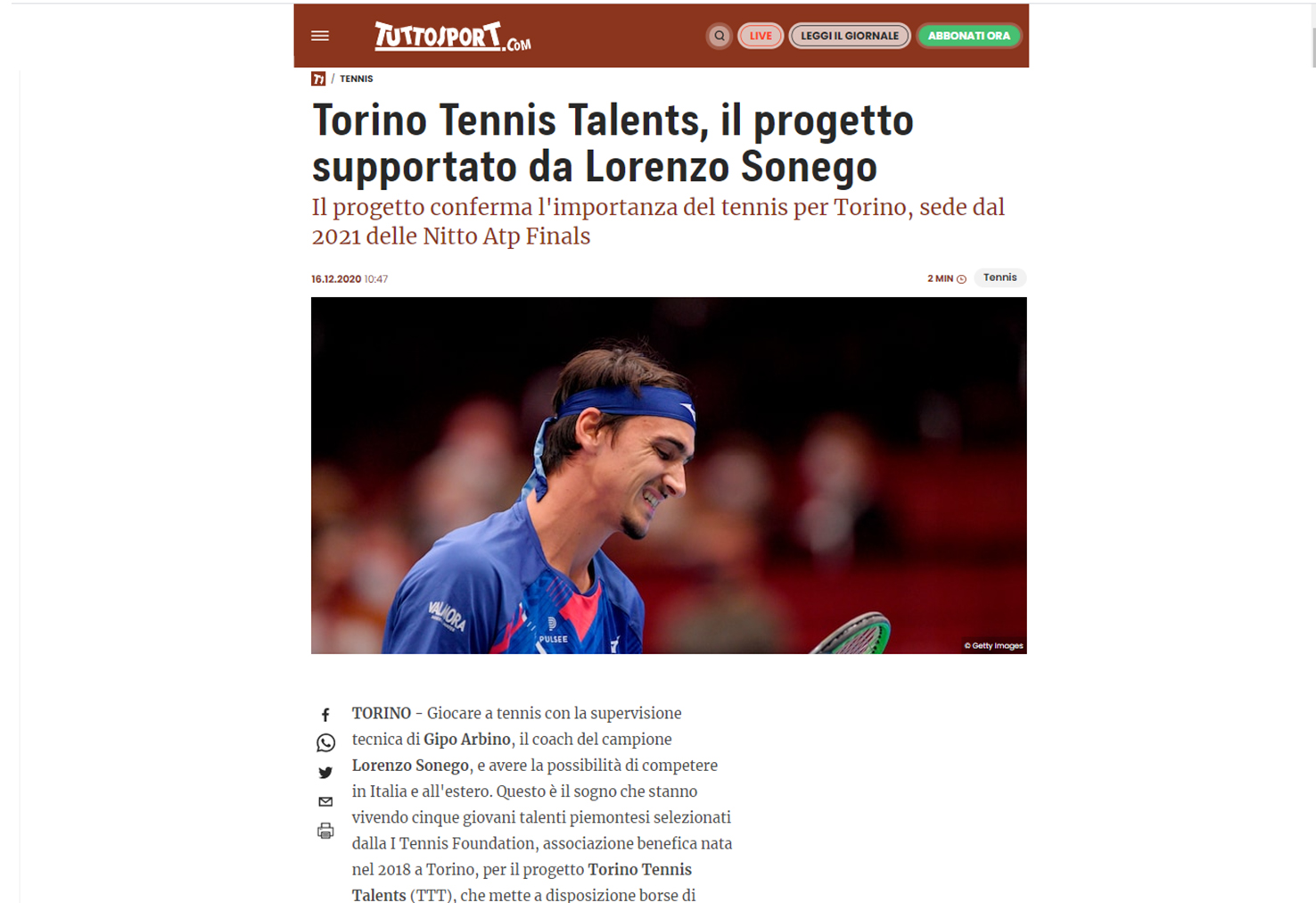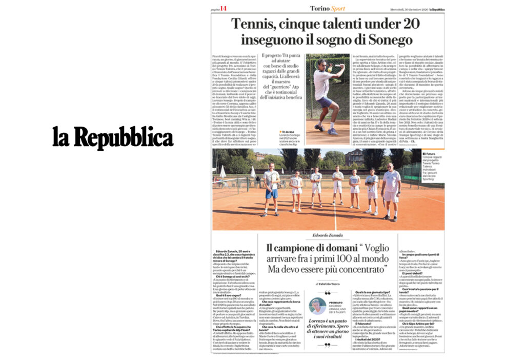 Ecco una selezione della rassegna stampa (cartacea e digitale) relativa alla presentazione del progetto Torino Tennis Talents, il servizio del TG di Rai 3 andato in onda giovedì 17 dicembre e l’intervista a Simone Bongiovanni, founder e presidente di I Tennis Foundation, su Sky Sport.